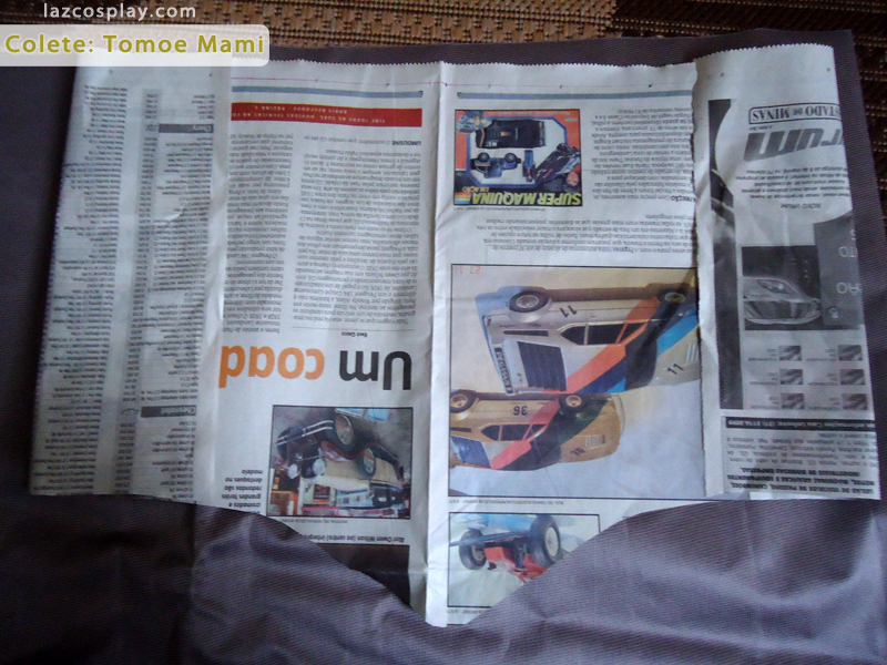 Corte um molde parecido com o da imagem no jornal. Essa será a parte da frente do seu corpete. Vá medindo o jornal em seu próprio corpo até ter certeza de que será este o tamanho desejado.